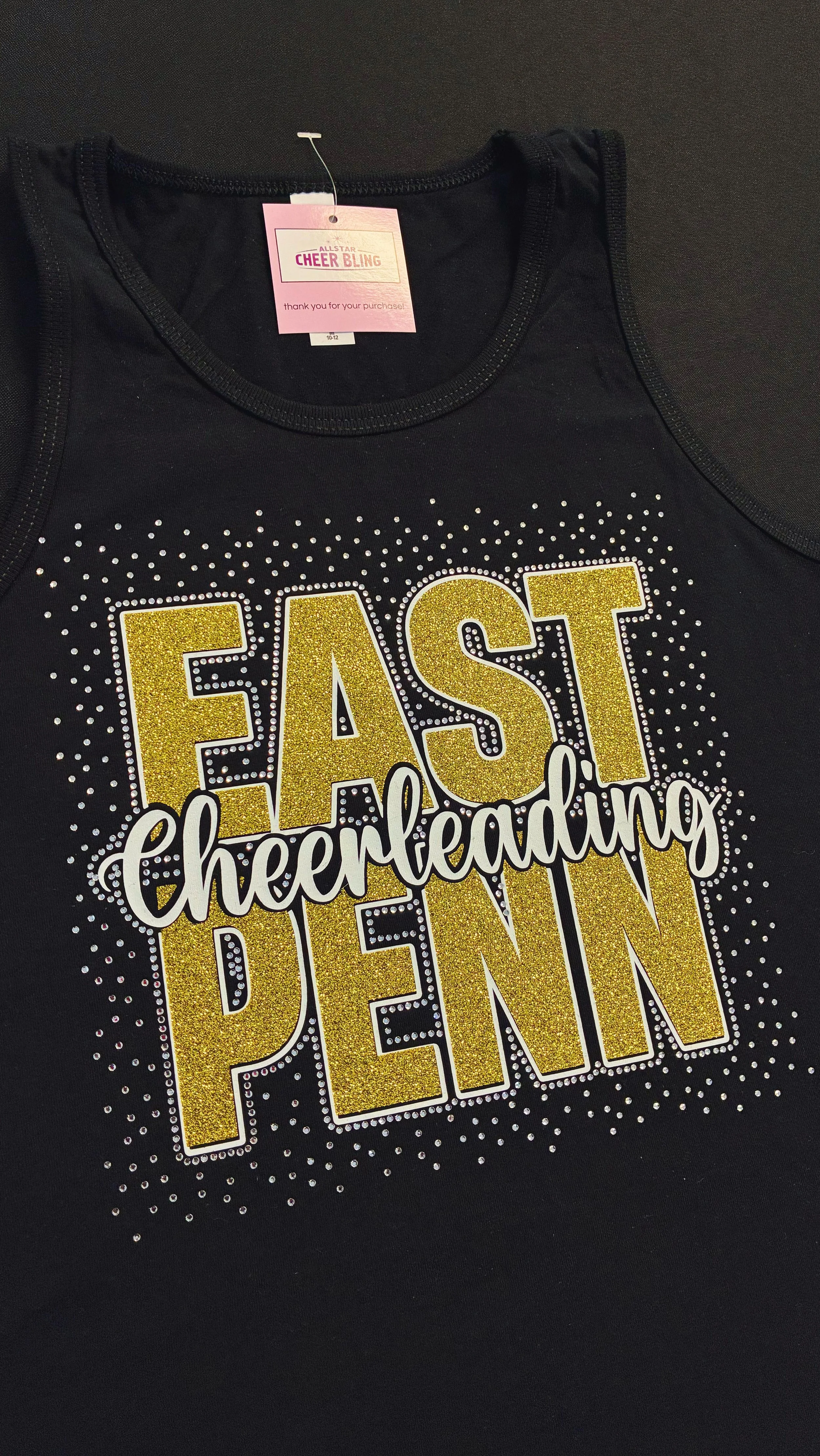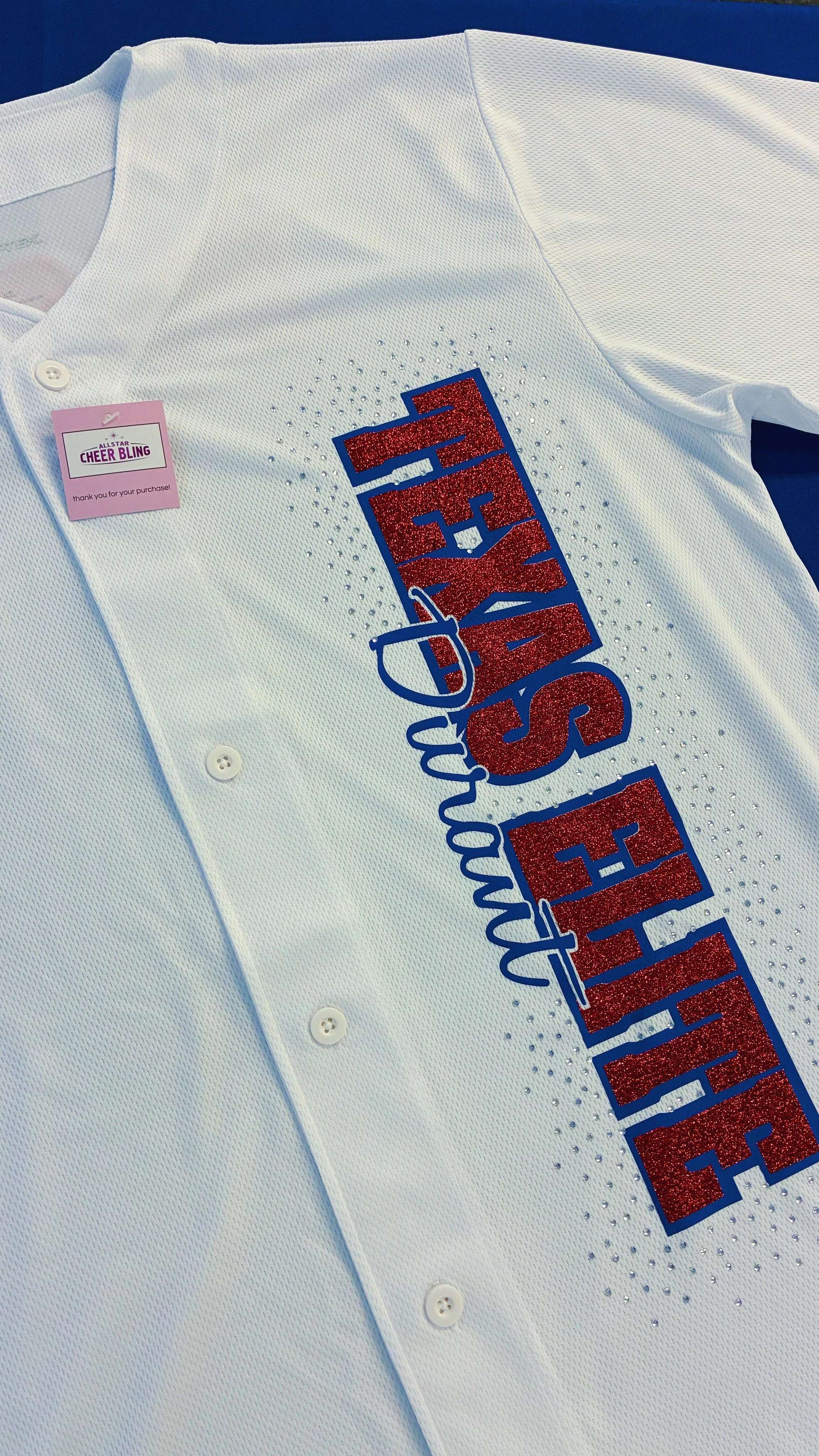 Custom cheer jerseys, custom dance jerseys, or button down jerseys for any sport or occasion. Our custom rhinestone jerseys are truly one of our favorite products. Pricing varies based on the amount of embellishment, so can work with you to maximize your budget.